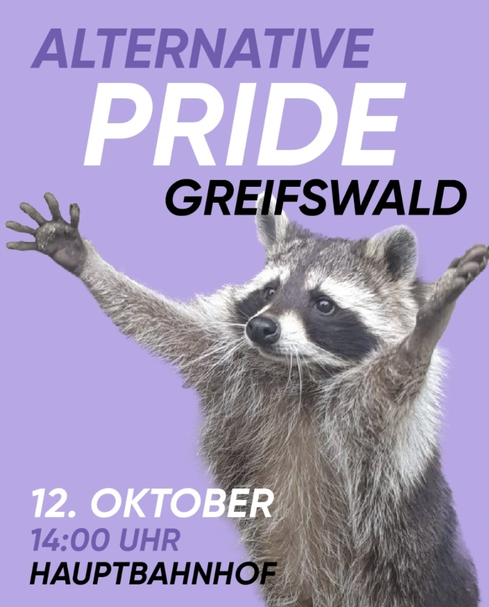 Alternative Pride in Greifswald Date & Time So., 12.10.2025 14:00 Kategorien aktuelle Termine queere Feier-und Gedenktage Alternative Pride um 14h in Greifswald ab Hauptbahnhof. MEHR DAZU