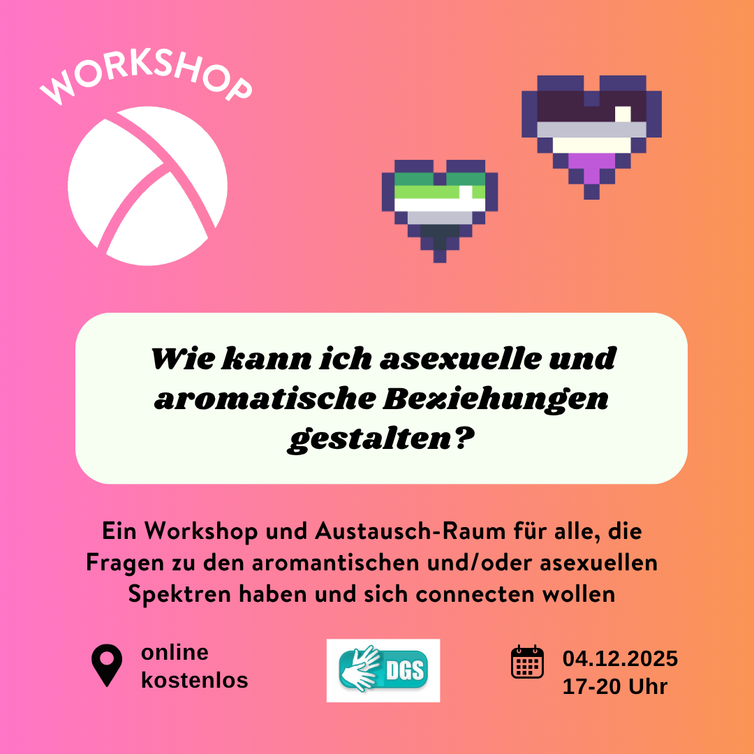 Ein Workshop und Austausch-Raum für alle, die Fragen zu den aromantischen und/oder asexuellen Spektren haben und sich connecten wollen